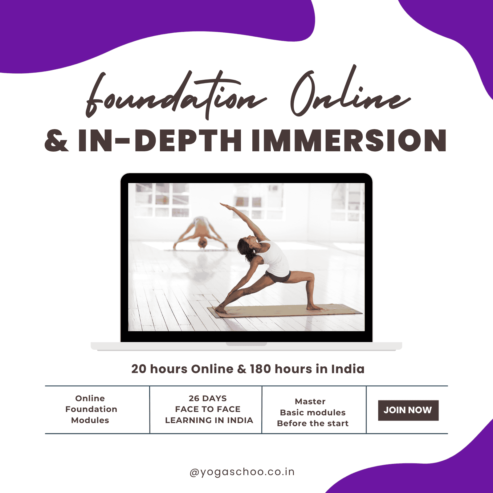 Path 2: Foundations Online & In-Depth Immersion: Lay the groundwork with essential online modules, then embark on a 28-day journey to India. Experience the traditional “old school” approach to yoga learning, deepening your knowledge and practice through intensive in-person sessions and cultural immersion.